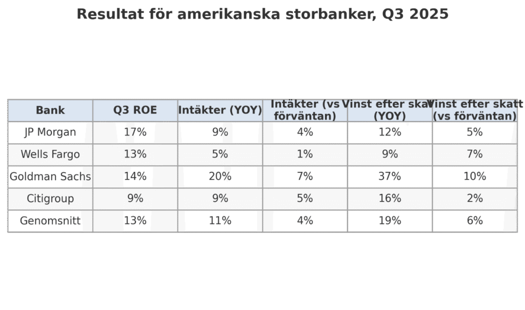JP Morgan fortsätter att dominera sektorn med 17 procent i ROE och både högre intäkter och resultat än väntat. Intäkterna uppgick till 47 miljarder dollar och vinsten till 14,4 miljarder, en ökning på tolv procent. Banken redovisade samtidigt kreditförluster på 3,4 miljarder dollar eller 0,24%, vilket var något mer än marknaden räknat med, till följd av några större konkurser inom billeasing och bildelar. VD Jamie Dimon var som vanligt tydlig i sin bedömning av omvärlden. I kommentaren till rapporten beskrev han en global marknad präglad av osäkerhet, handelstullar, höga tillgångspriser och en inflation som inte riktigt vill ge vika riktigt. Han varnade också för tecken på potentiella bubblor i delar av kreditmarknaden och betonade att världen nu befinner sig i ett läge där försiktighet bör råda.