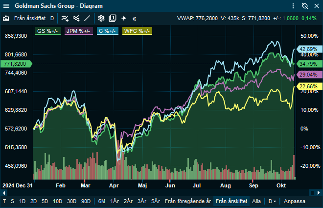 Goldman Sachs levererade kanske det mest positiva kvartalet. Intäkterna steg med 20 procent till drygt 15 miljarder dollar, medan vinsten ökade hela 37 procent till 4,1 miljarder. Investment banking och trading gick starkt. Kostnaderna steg dock ordentligt, med 14 procent år över år, främst på grund av högre rörliga ersättningar efter det starka kvartalet. VD David Solomon konstaterade att banken just nu upplever ett tydligt momentum, där kunderna i större utsträckning söker rådgivning i komplexa affärer, men betonade samtidigt att marknaden rör sig i cykler och att man inte kan räkna med att nuvarande aktivitetsnivå består för evigt.