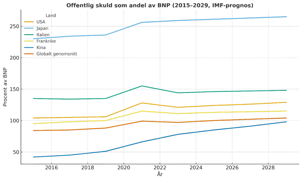 När räntorna ligger på högre nivåer blir statsskulden inte bara större i nominella tal, den blir också en tyngre del av statsbudgeten eftersom kostnaden att finansiera skulden blir högre. För regeringar betyder detta att en större del av budgeten måste allokeras till ränta i stället för till investeringar, välfärd eller infrastruktur. Det är ett klassiskt dilemma, med hög skuld behöver man stabil tillväxt för att hålla räntan under kontroll och en hög ränta gör samtidigt tillväxten svagare. Som jämförelse kan man konstatera att USA kommer lägga mellan 15–18% av de federala utgifterna på räntekostnaderna för statsskulden 2025, det finns lite olika estimat därav ingen exakt siffra ovan. Och USA är ju ingalunda värst enligt grafen i inledningen, men det är världens största ekonomi och kan därmed påverka världsekonomin om marknaden börjar ifrågasätta USA:s återbetalningsförmåga.