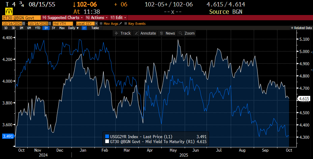 Siffrorna visar på risker för många länder framöver där skulduppbyggnaden ökar ganska snabbt tillsammans med kostnadsökningar och ger då i förlängningen begränsat utrymme för manövrering och möjlighet till självständig ekonomisk politik. För inte så många år sedan kunde stater låna expansivt när räntorna sjönk paradoxalt nog ökade skulden men räntekostnaderna höll sig under kontroll tack vare fallande räntor. Den dynamiken ser annorlunda ut idag då räntorna har stigit de senaste åren, och marknadens prissättning av ränte spreadar också visar på större osäkerhet, nedan illustrerat av 2åringen vs 30 åringen i USA där den senare inte alls vill komma ned i samma takt trots FED:s räntesänkningar, vilket i sin tur innebär att räntesänkningarna hittills haft liten påverkan på finansieringen av statsskulden i USA.