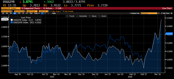 Marknadsreaktionerna efter beskedet speglade denna tolkning. De amerikanska marknadsräntorna steg längs hela kurvan, med särskilt tydliga uppgångar i de kortare löptiderna, vilket indikerar att investerare justerade upp sina förväntningar på hur länge räntan kommer att ligga kvar på nuvarande nivåer. Se US 2- och 10 åring nedan.