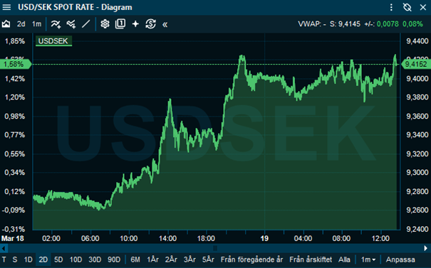 Samtidigt stärktes dollarn, vilket ytterligare understryker att marknaden uppfattade kommunikationen som mer restriktiv än tidigare. På aktiemarknaden var reaktionen negativ, där de större indexen föll under handelsdagen i takt med att riskaptiten minskade. Se USDSEK-handeln under onsdags- och del av torsdagshandeln nedan.