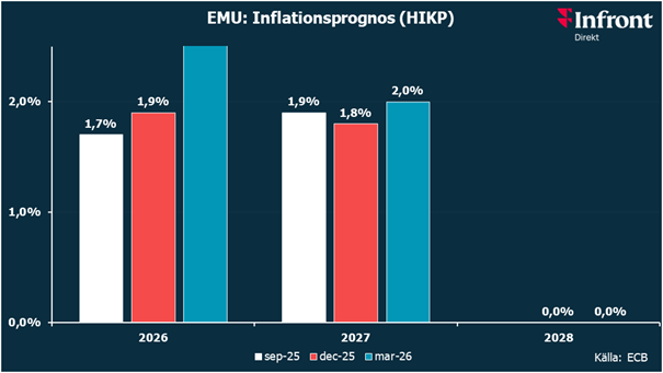 ECB lämnade också som väntat styrräntorna oförändrade, med depositräntan kvar på 2,00 procent. Fokus låg i uttalandena även här på den ökade osäkerheten till följd av konflikten i Mellanöstern, som bedöms skapa uppåtrisker för inflationen och samtidigt dämpa tillväxten.