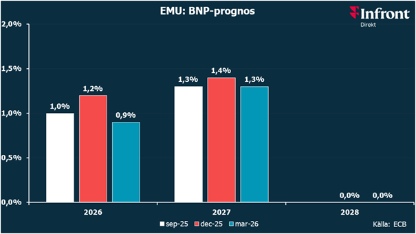 ECB har också justerat upp sina inflationsprognoser samtidigt som tillväxtutsikterna revideras ned. Inflationstakten väntas nu uppgå till 2,6 procent i år, med fortsatt nivåer kring målet kommande år. Samtidigt sänks BNP-prognosen för i år till 0,9 procent, vilket alltså redan visar på en svagare konjunkturbild. Se förändringarna nedan.