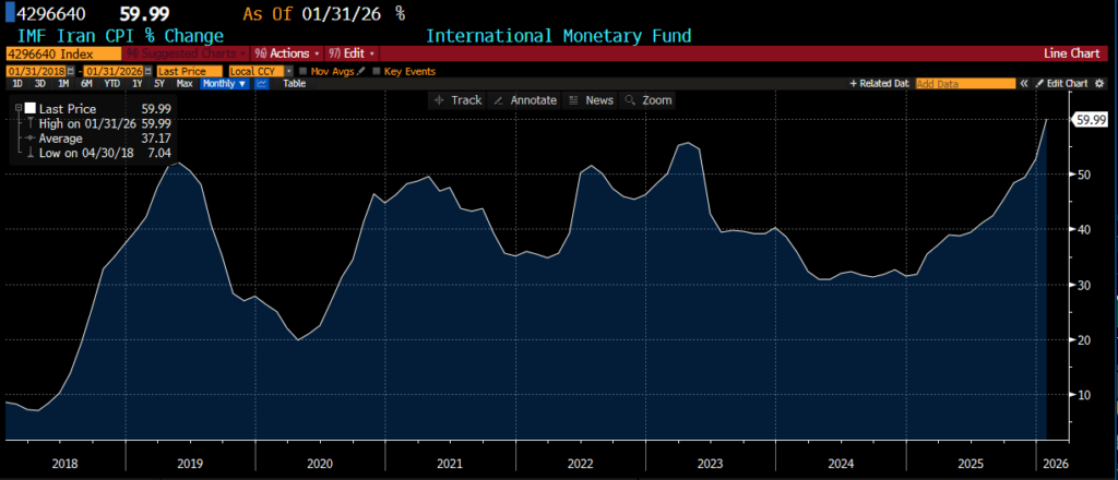 För den iranska befolkningen är situationen betydligt mer ansträngd. Inflationstakten är hög och har under lång tid urholkat köpkraften, samtidigt som valutan försvagats kraftigt. Under det senaste året har rialen tappat extremt i värde mot dollarn, vilket förstärker en redan negativ spiral. Prisökningarna är särskilt tydliga på livsmedel, där hushållen successivt tvingats prioritera bort allt av konsumtionsvaror till förmån för endast basala näringskällor. Detta har bidragit till ökade klyftor och ett växande missnöje, även om regimens kontroll hittills har slagit ner alla protester, som vi ju senast mins från början av 2026, se inflationsutvecklingen nedan.