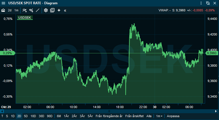 Marknadens reaktioner blev blandad. Inför beskedet var nästa sänkning i december i stort sett inprisad, men efter Powells presskonferens dämpades förväntningarna. Dollarn stärktes, obligationsräntorna steg med nära tio punkter på tvååringen och börserna gick från plus till minus under talet, för att sedan återhämta sig mot stängning. Se exempelvis USDSEK under timmarna före och efter FED-annonseringen nedan.