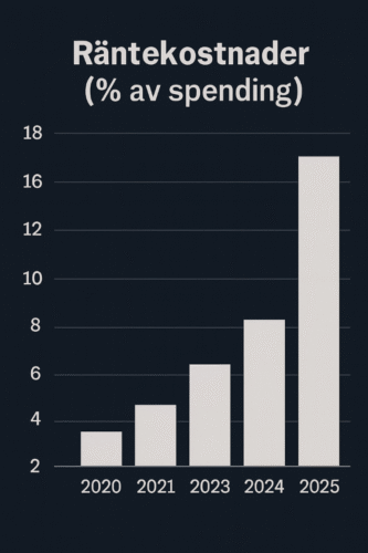 I vår tidigare spaning betonade vi hur snabbt statsskulderna i världen ökar och hur de höga räntorna för första gången på länge gör skuldbördan riktigt kännbar i budgetarna. USA är inget undantag utan tvärtom är det nu sinnebilden för just den problematik IMF varnade för. När en så stor del av budgeten måste gå till räntor blir utrymmet för investeringar och reformer allt mindre. Beräkningar pekar på att ränteutgifterna kommer att motsvara upp till 18 procent av de federala utgifterna redan nästa år. Det är en dramatisk förändring jämfört med bara för några år sedan, då räntekostnaden knappt märktes i budgeten, se graf nedan.