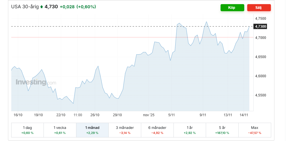 Det är tydligt att marknaden, i alla fall för tillfället, har börjat prissätta ökad oro för sektorn och att momentumet från oktober nu mattas. Bland annat har högt värderade bolag inom AI-sektorn drabbats extra mycket. Palantir Technologies föll nästan 7 % under en enskild dag och är ned omkring 11 % sedan i tisdags. Med höga värderingar, exempelvis Palantirs P/E-tal på 417, blir marknaden mer känslig för negativa signaler. Räntorna har också börjat pressas upp efter de lägre nivåerna vi såg fram till månadsskiftet, efter FED:s senaste sänkning, framför allt den amerikanska 30-åringen, se graf nedan, och investerare samtidigt ifrågasatte “AI-bubblan” så slog sentimentet över från optimistiskt till pessimistiskt.