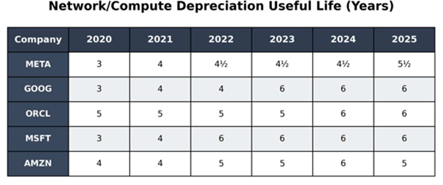Problemet enligt Burry, är inte nödvändigtvis investeringarna i sig, utan att de måste upprepas med allt kortare mellanrum. AI-investeringarna blir inte ett engångsprojekt, utan ett löpande åtagande med enorma kontinuerliga reinvesteringskrav under överskådlig framtid. Samtidigt har flera bolag dragit nytta av att redovisa sina avskrivningar för hårdvaran över succesivt allt längre tidshorisonter, vilket kortsiktigt förbättrar vinsterna. Meta höjde tidigare i år sin avskrivningstid till 5,5 år, vilket ökade resultatet med nära två miljarder dollar. Amazon har däremot valt att gå åt motsatt håll och återgå till en femårig livslängd för delar av sin serverpark, med motiveringen att utvecklingstakten inom AI nu ökar så snabbt att längre avskrivningar inte längre är realistiska. Burry har sammanställt avskrivningstakten och förändringarna av dessa enligt grafen nedan och hävdar att alla bolagen har höjt sina avskrivningstider för hårdvara enligt nedan.