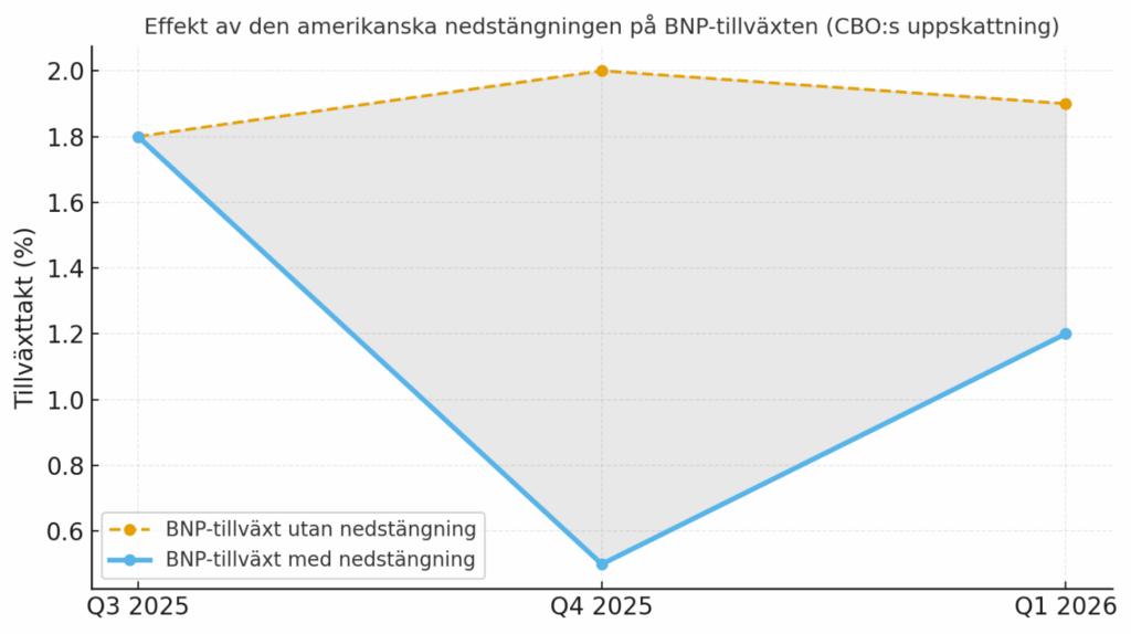 Effekterna på ekonomin har varit tydliga: Congressional Budget Office (CBO) uppskattar att BNP-tillväxten för fjärde kvartalet dämpas med cirka 1,5 procentenheter på grund av nedstängningen, och att endast drygt hälften av minuseffekten kommer att kompenseras under första kvartalet 2026, se graf nedan.
