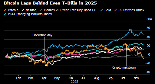 Bitcoin har tappat drygt 30 procent från årets toppnivåer och utvecklas nu svagare än både aktier, obligationer och till och med amerikanska statsskuldväxlar. Det som länge skulle vara en inflationshedge, en tillväxtmotor och ett oberoende komplement i portföljen har under 2025 agerat sänke, se nedan jämförelse mellan tillgångars utveckling.
