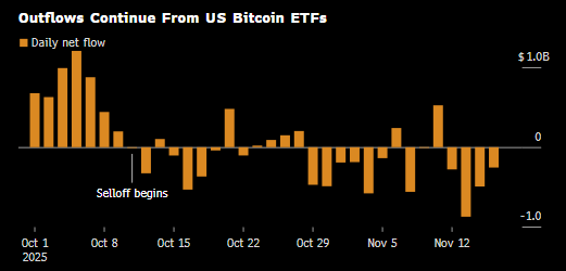 Orsakerna är flera. Den kraftiga kraschen i oktober, då hävstångspositioner motsvarande omkring 19 miljarder dollar likviderades, har lämnat djupa spår i marknadens riskvilja. Samtidigt har ett svagare makroklimat i Asien och sjunkande teknikvärderingar fått riskaptiten globalt att falla. Se senaste tidens flöden i Bitcoin-ETF:er nedan.
