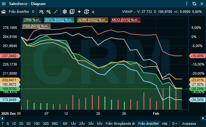 Nedan några mjukvaru- och finansbolags utveckling sedan årsskiftet. Salesfoce, Intuit, Adobe, Moody´s och Factset,
