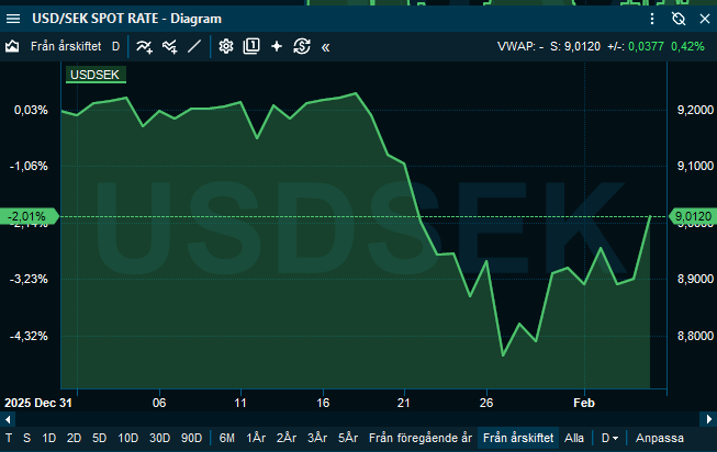 I veckan släpptes protokollet från Riksbankens senaste räntemöte. En närmare titt visade att styrelsen har blivit överraskande duvaktig jämfört med i december. Per Jansson övervägde att rösta för en sänkning och Thedéen är öppen för en sänkning om inflationen återigen överraskar negativt, särskilt om även tillväxten blir en besvikelse. Vi menar därmed att sannolikheten för en räntesänkning i vår har ökat. De preliminära inflationssiffrorna för januari som publiceras i dag och ger oss mer vägledning kring sannolikheten för ytterligare sänkning. Den svenska kronan, som inlett året väldigt starkt, hade sin sämsta dag det sedan årsskiftet samtidigt som marknaden ökade sin tro på en räntesänkning under våren, se USDSEK nedan sedan årsskiftet.