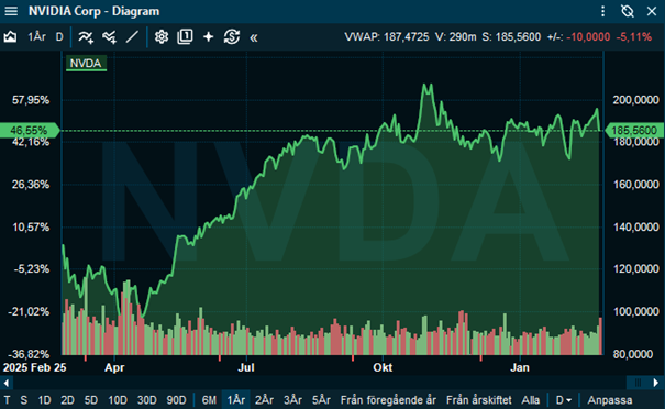Trots detta var aktiereaktionen i efterhandeln relativt försiktig, med en uppgång på endast någon procent. Det säger en hel del om förväntningsbilden inför rapporten. Nvidia har under de senaste åren vant marknaden vid att överträffa prognoser med bred marginal, och värderingen reflekterar redan en mycket stark och uthållig tillväxt. När ribban ligger högt krävs det mer än bara en tydlig “beat” för att skapa ett nytt ben upp i aktien. Dessutom finns ju den växande oron kring lönsamhet i AI-investeringar, hur länge den exceptionella tillväxttakten i datacenter kan fortsätta, hur snabbt hyperscalers och andra kunder kan absorbera kapaciteten samt hur konkurrensen från egna AI-chip hos stora molnaktörer kan påverka marginalerna på sikt. Alla frågor som vi har diskuterat här tidigare under de senaste månaderna. Den försiktiga kursreaktionen på onsdagskvällen förbyttes i nedgång under torsdagen, med i skrivande stund -5,15%, vilket visar att marknaden redan hade prisat in en stor del av det positiva scenariot.