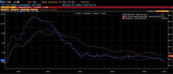Utanför Sverige fortsatte inflationsbilden att ljusna. I euroområdet sjönk HIKP-inflationen till 1,7 procent i januari från 2,0 procent i december, helt i linje med förväntningarna och snabbestimatet. Det innebär att inflationen nu tydligt ligger under ECB:s tvåprocentsmål och stärker bilden av att pristrycket i eurozonen är på väg att normaliseras i ganska snabb takt nu.